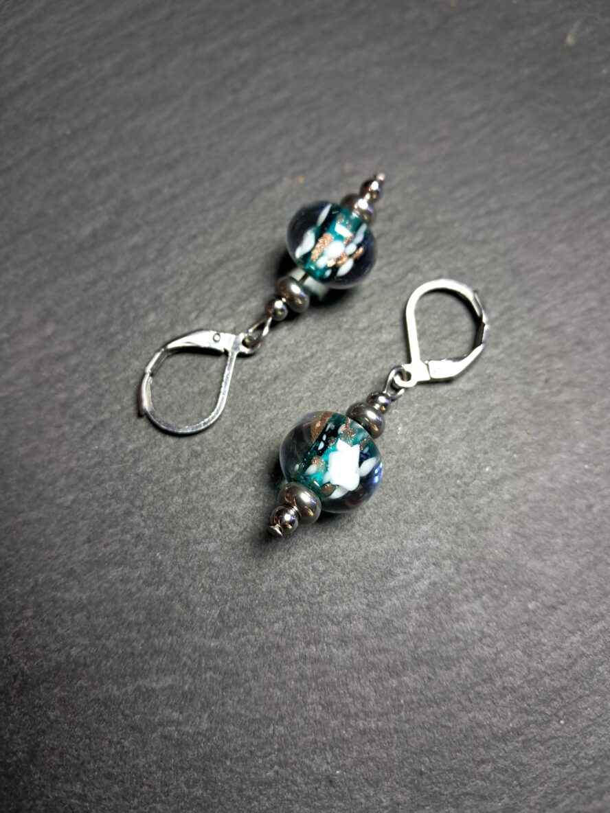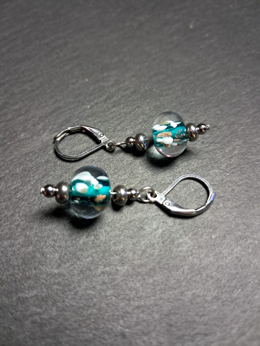 Granulés d’Aventurine et de Cristal de Murano blanc recouverts de Cristal de Murano transparent.