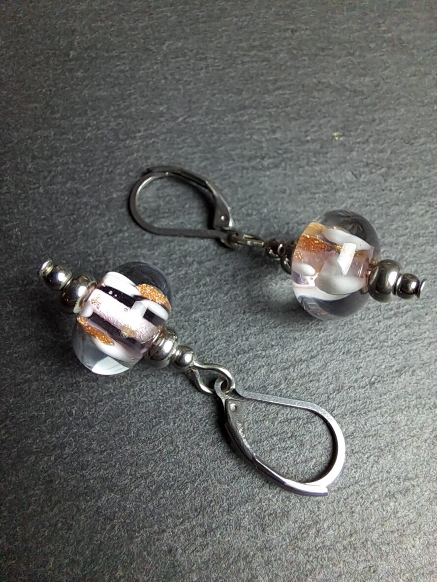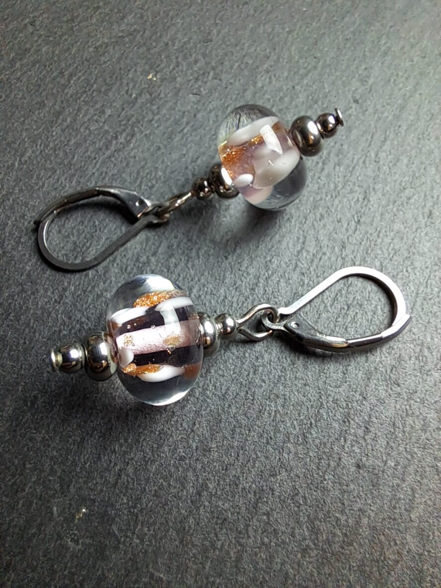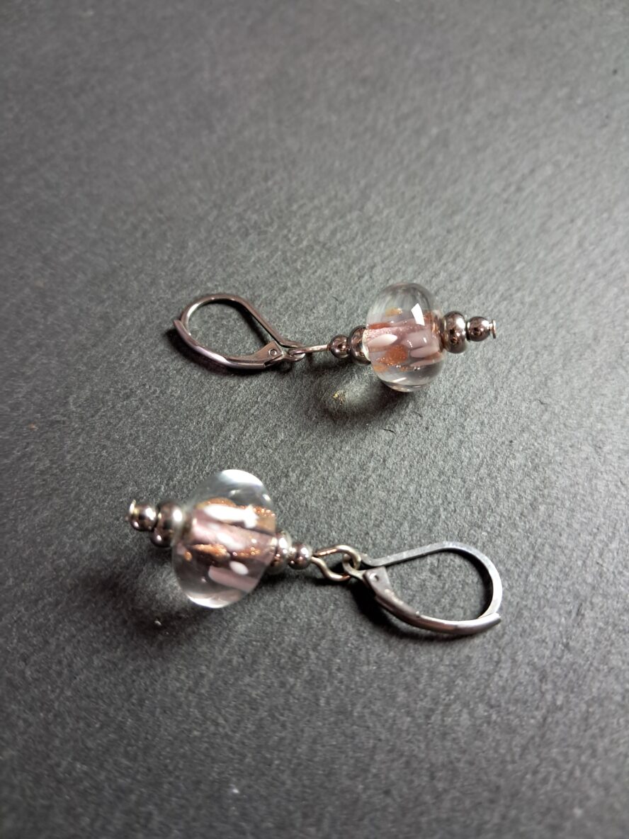 Granulés d’Aventurine et de Cristal de Murano blanc recouverts de Cristal de Murano transparent.