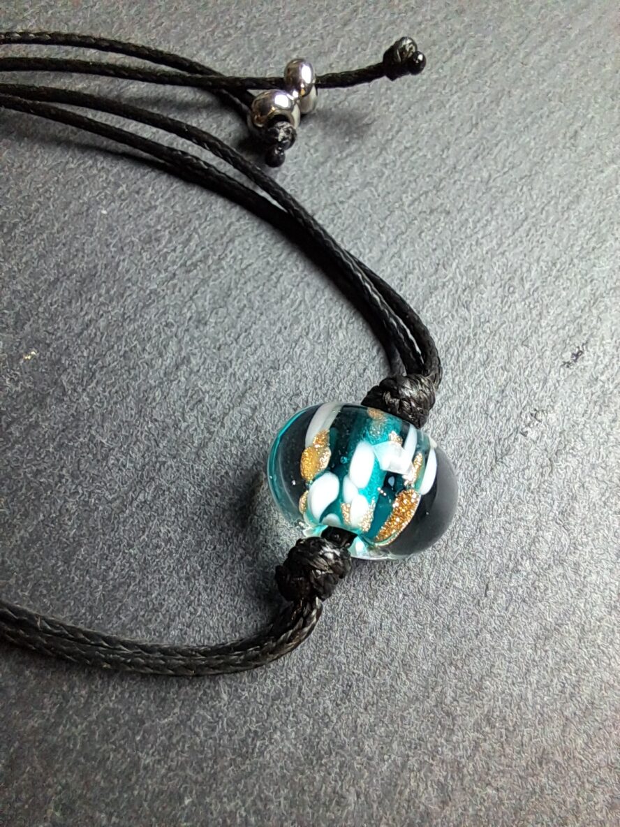 Granulés d’Aventurine et de Cristal de Murano blanc recouverts de Cristal de Murano transparent.