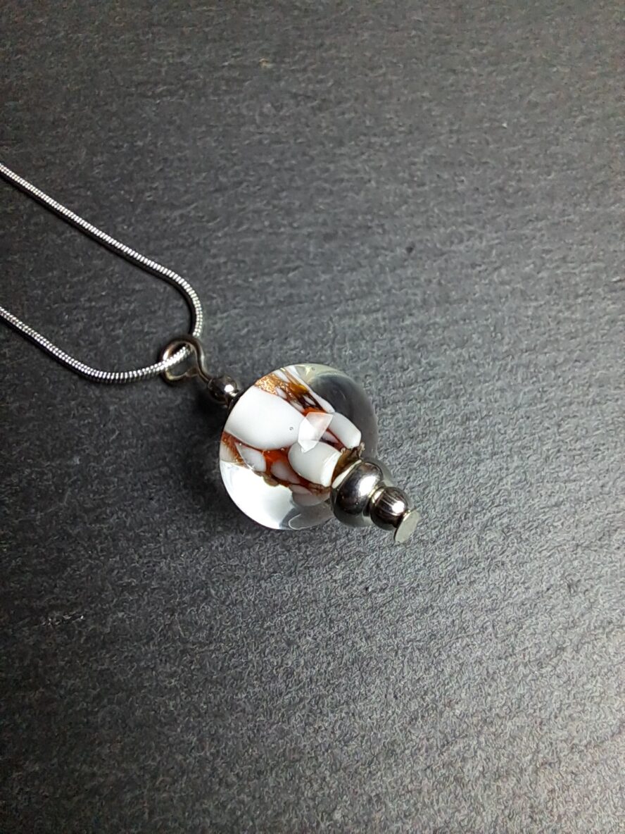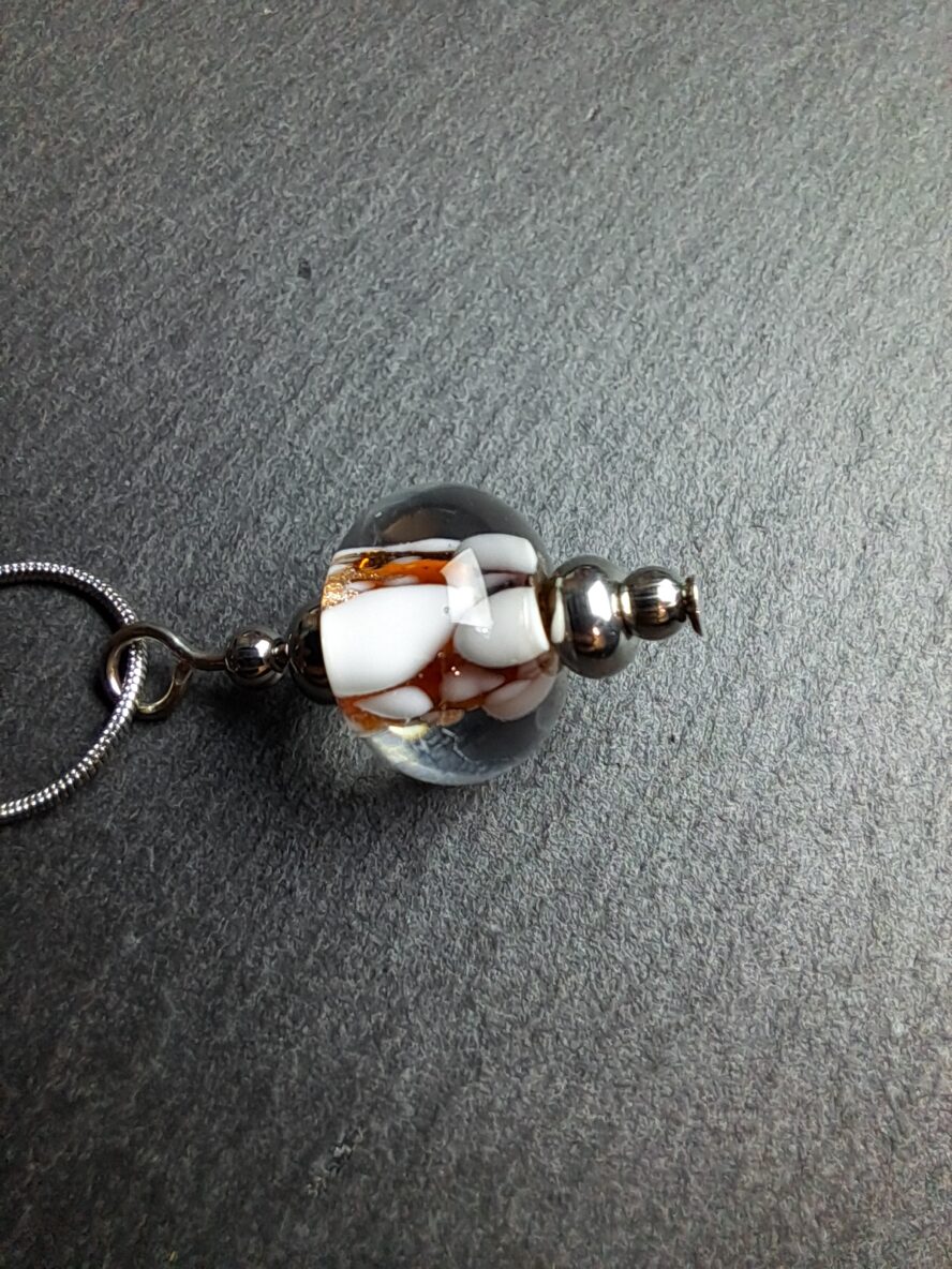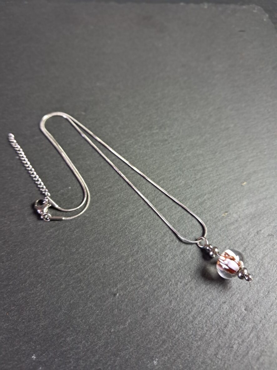 Granulés d’Aventurine et de Cristal de Murano blanc recouverts de Cristal de Murano transparent.
