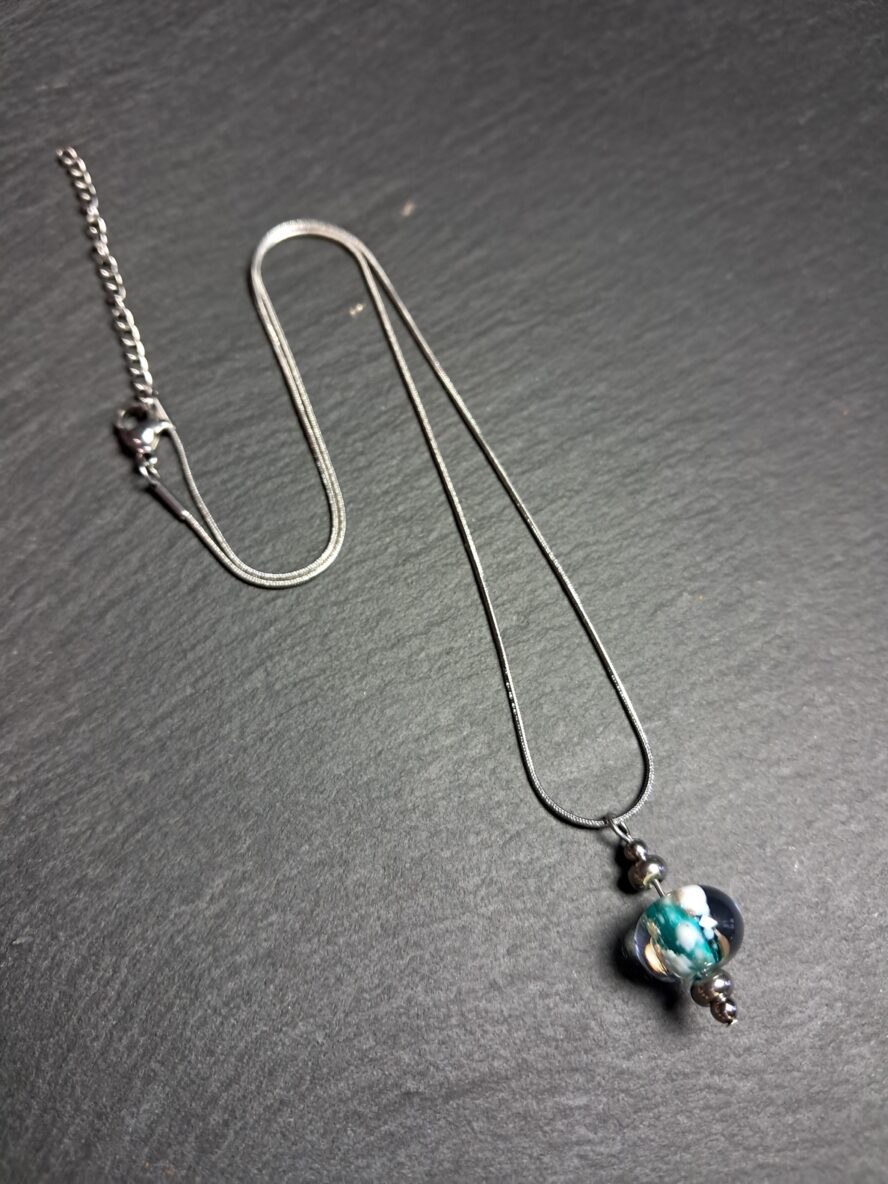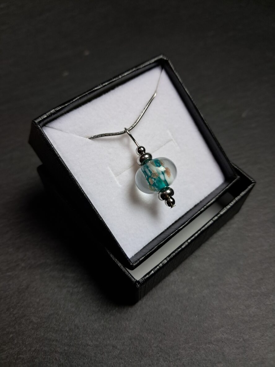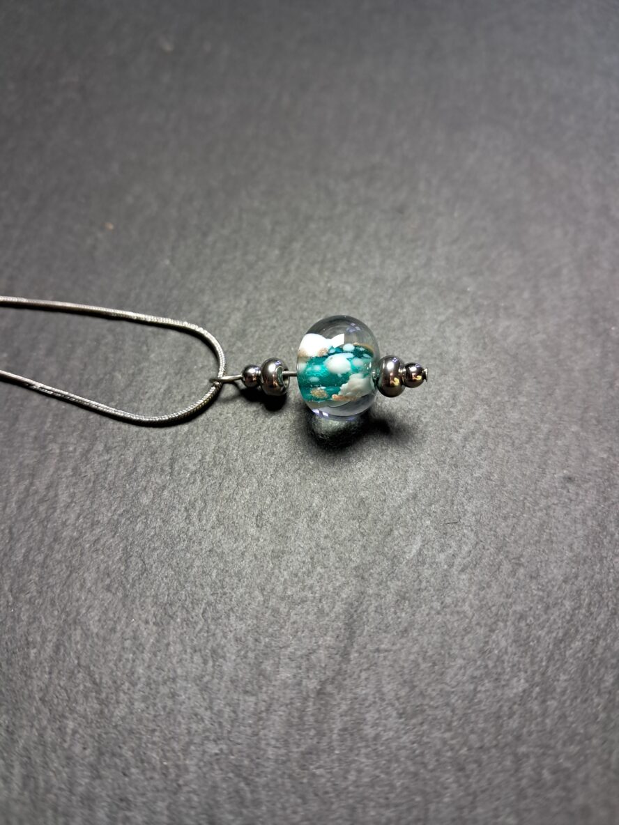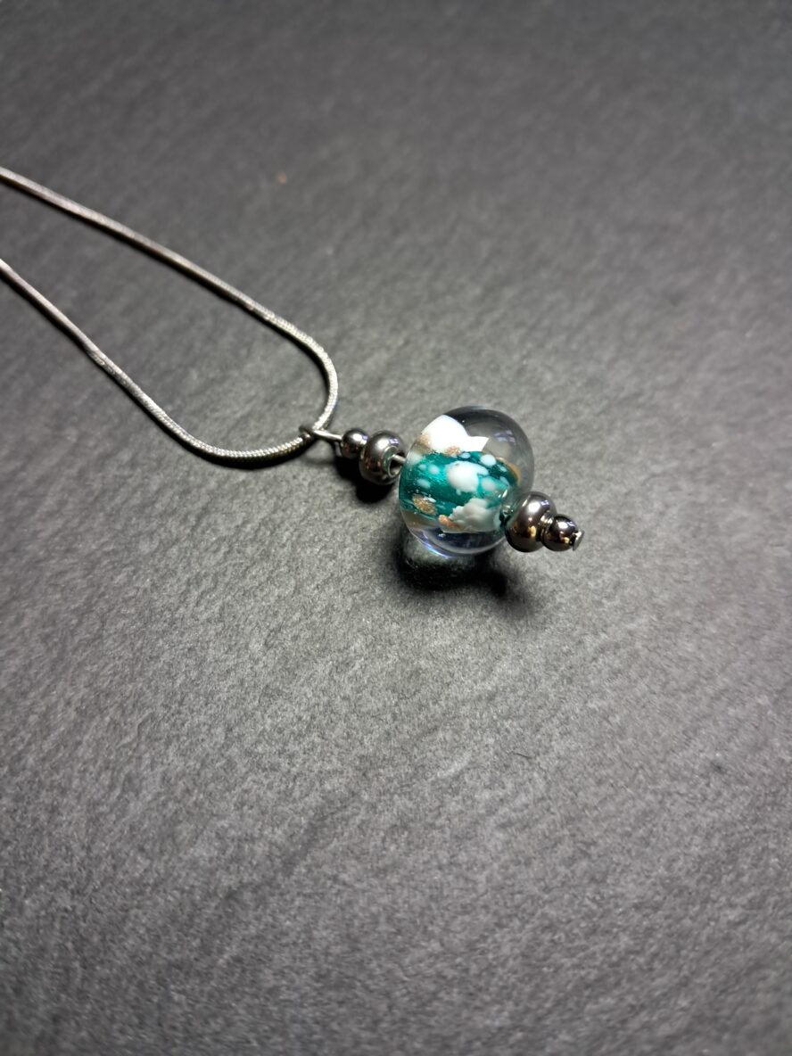 Granulés d’Aventurine et de Cristal de Murano blanc recouverts de Cristal de Murano transparent.