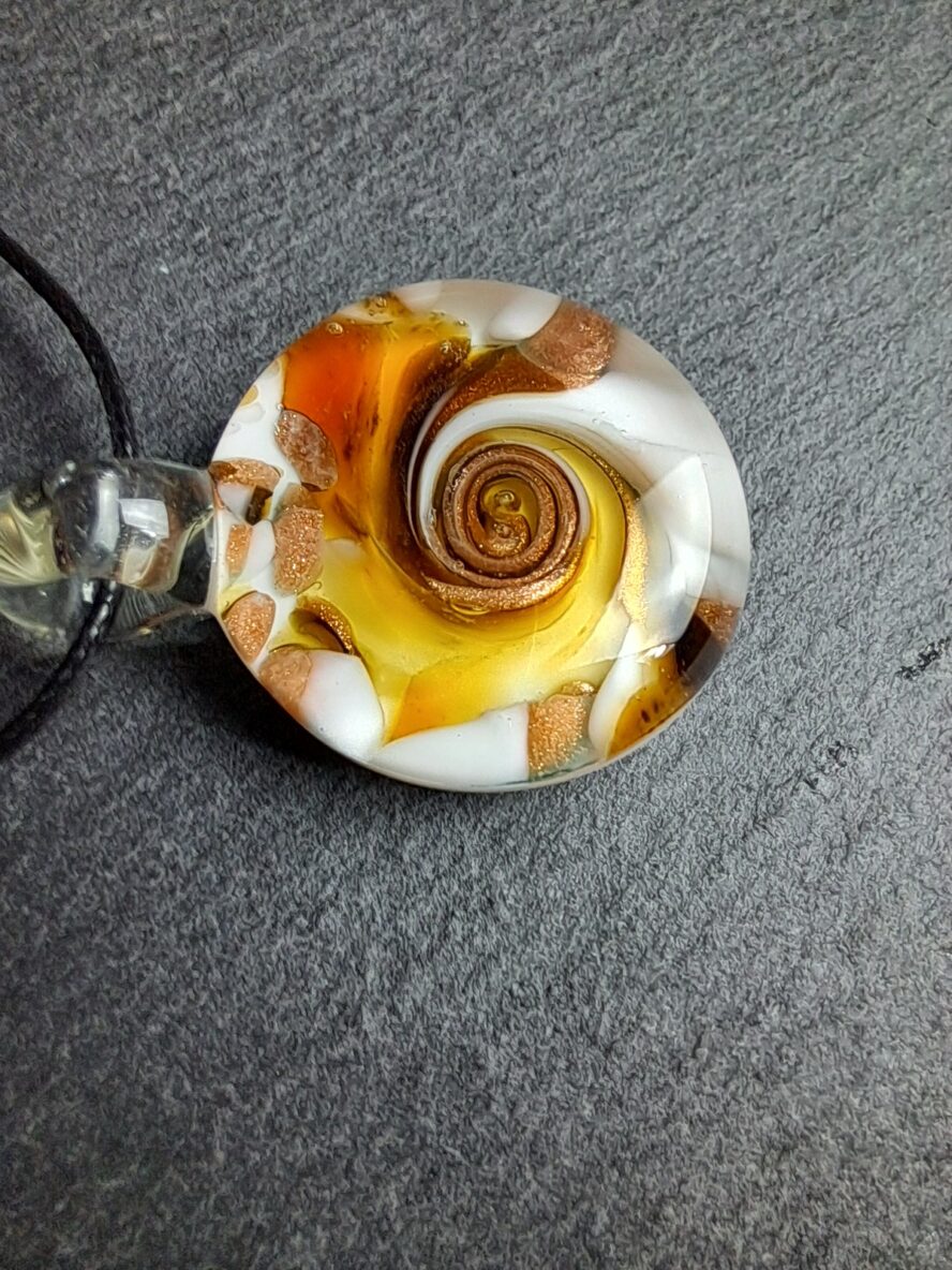 Cristal de Murano transparent, granulés d’Aventurine et de Cristal de Murano coloré spiralés, emprisonnés par un fond de Cristal de Murano blanc.
