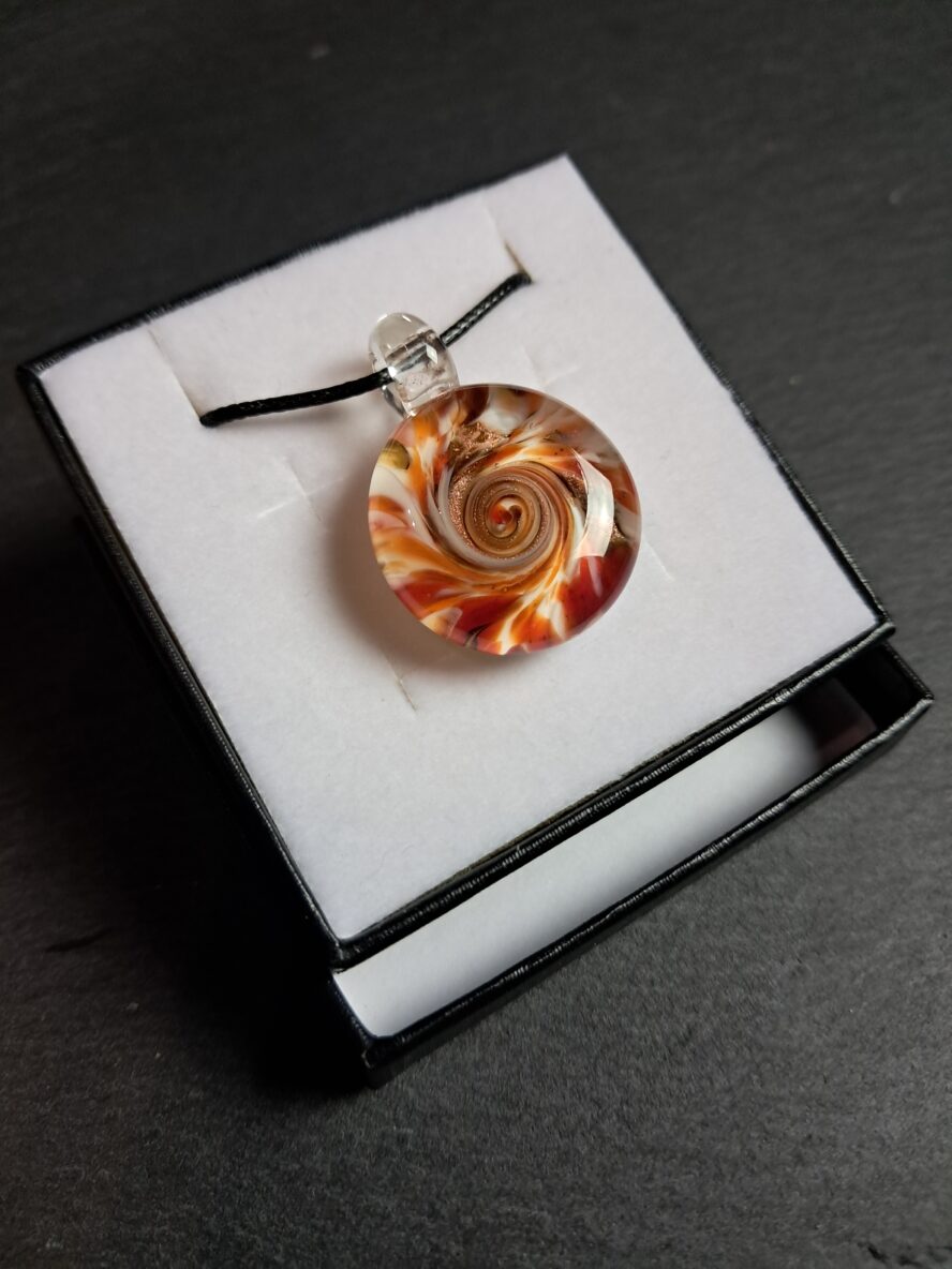 Cristal de Murano transparent, granulés d’Aventurine et de Cristal de Murano coloré spiralés, emprisonnés par un fond de Cristal de Murano blanc.