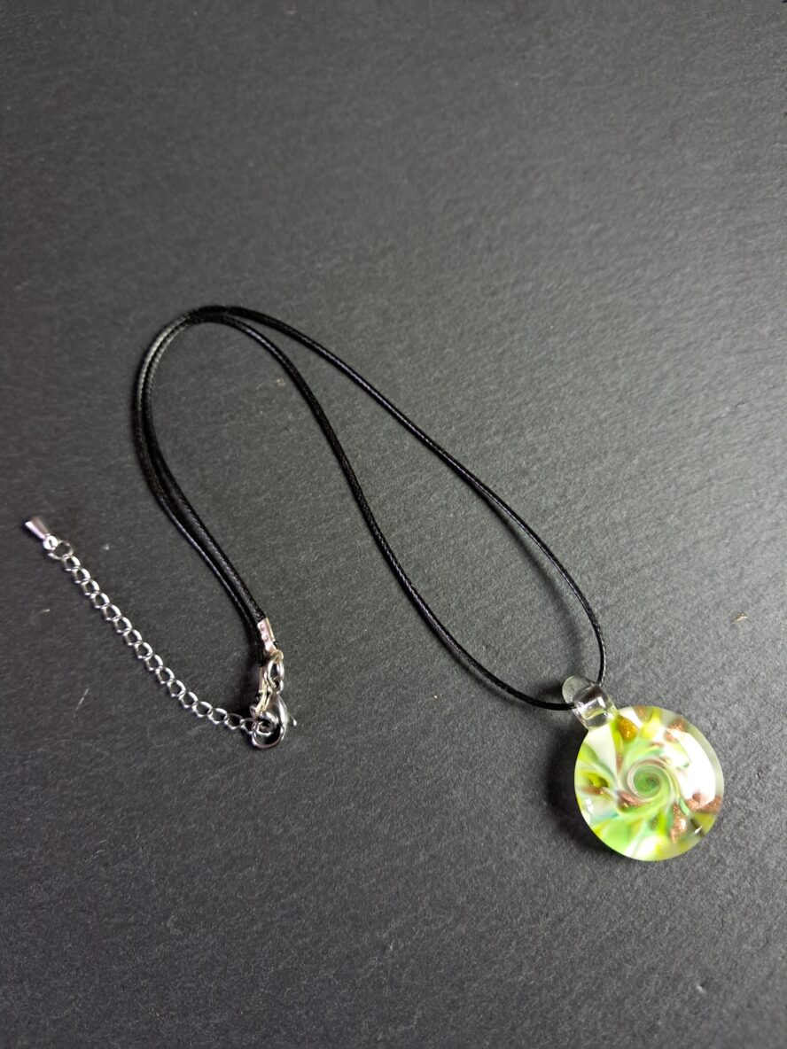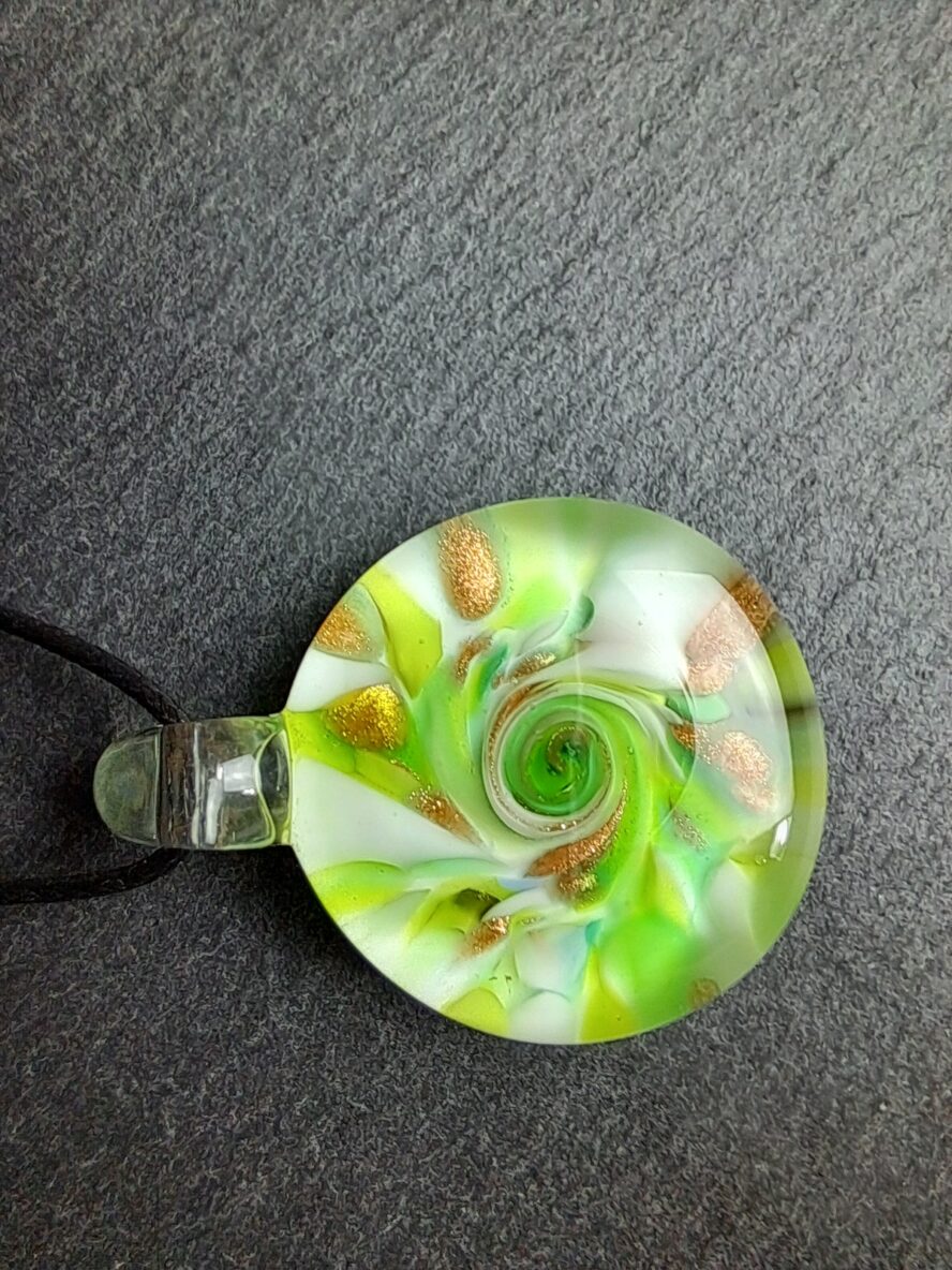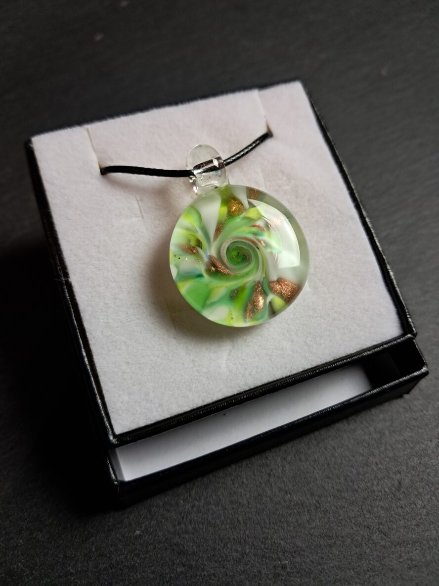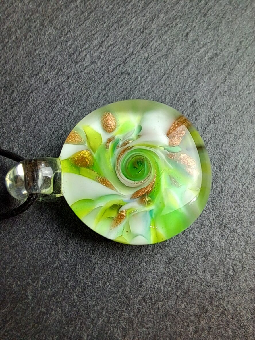 Cristal de Murano transparent, granulés d’Aventurine et de Cristal de Murano coloré spiralés, emprisonnés par un fond de Cristal de Murano blanc.