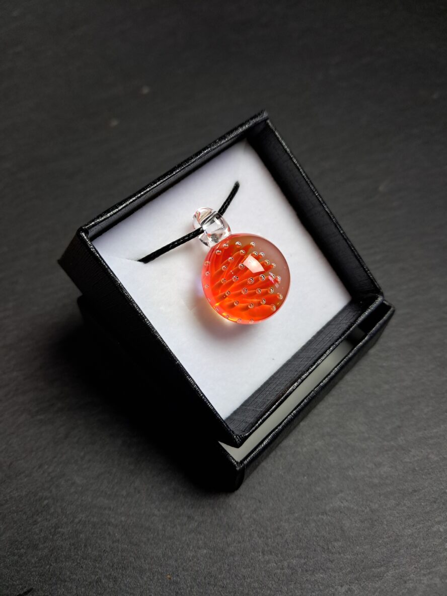 Cristal de Murano coloré poussé dans du Cristal de Murano transparent. Bulles d’air emprisonnées.