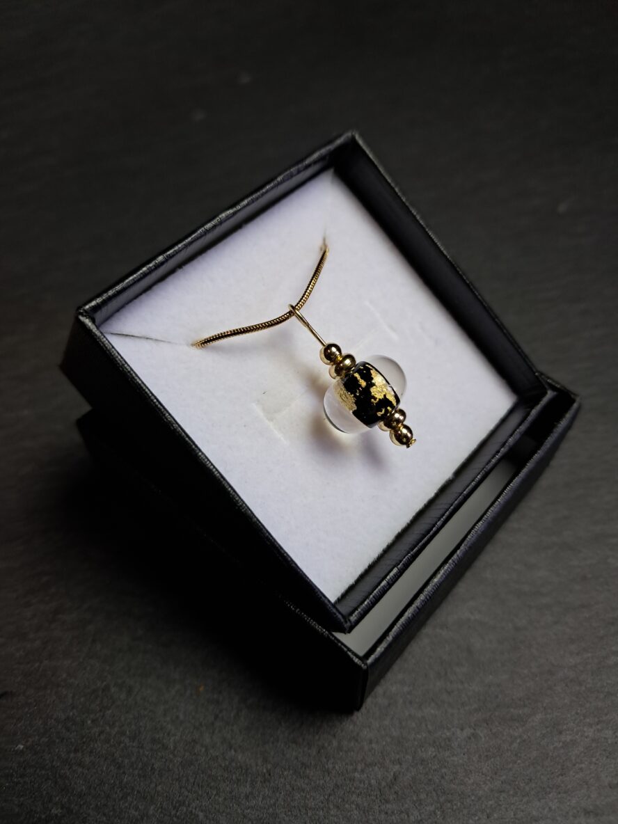 Feuille d’Or 24 Carats emprisonnée entre deux couches de Cristal de Murano (l’une colorée et l’autre transparente).