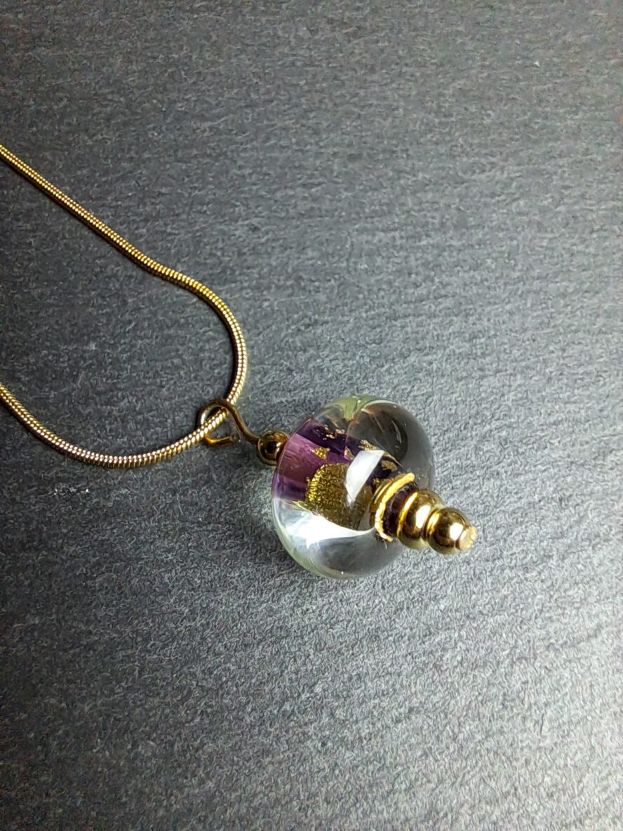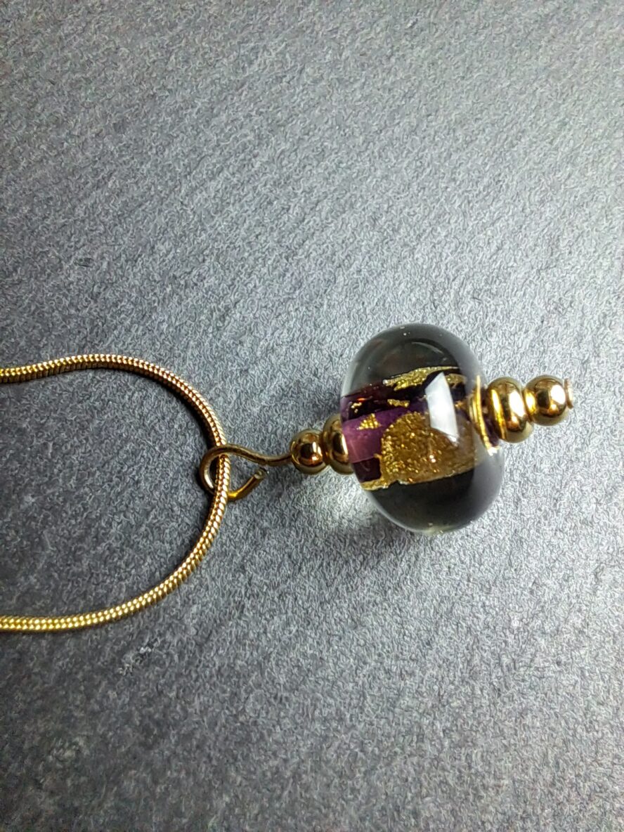 Feuille d’Or 24 Carats emprisonnée entre deux couches de Cristal de Murano (l’une colorée et l’autre transparente).