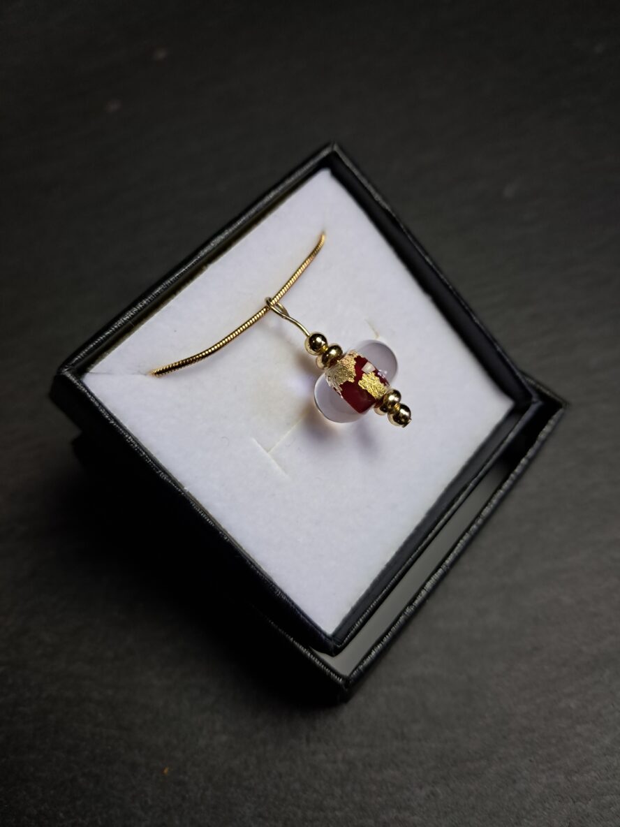 Feuille d’Or 24 Carats emprisonnée entre deux couches de Cristal de Murano (l’une colorée et l’autre transparente).